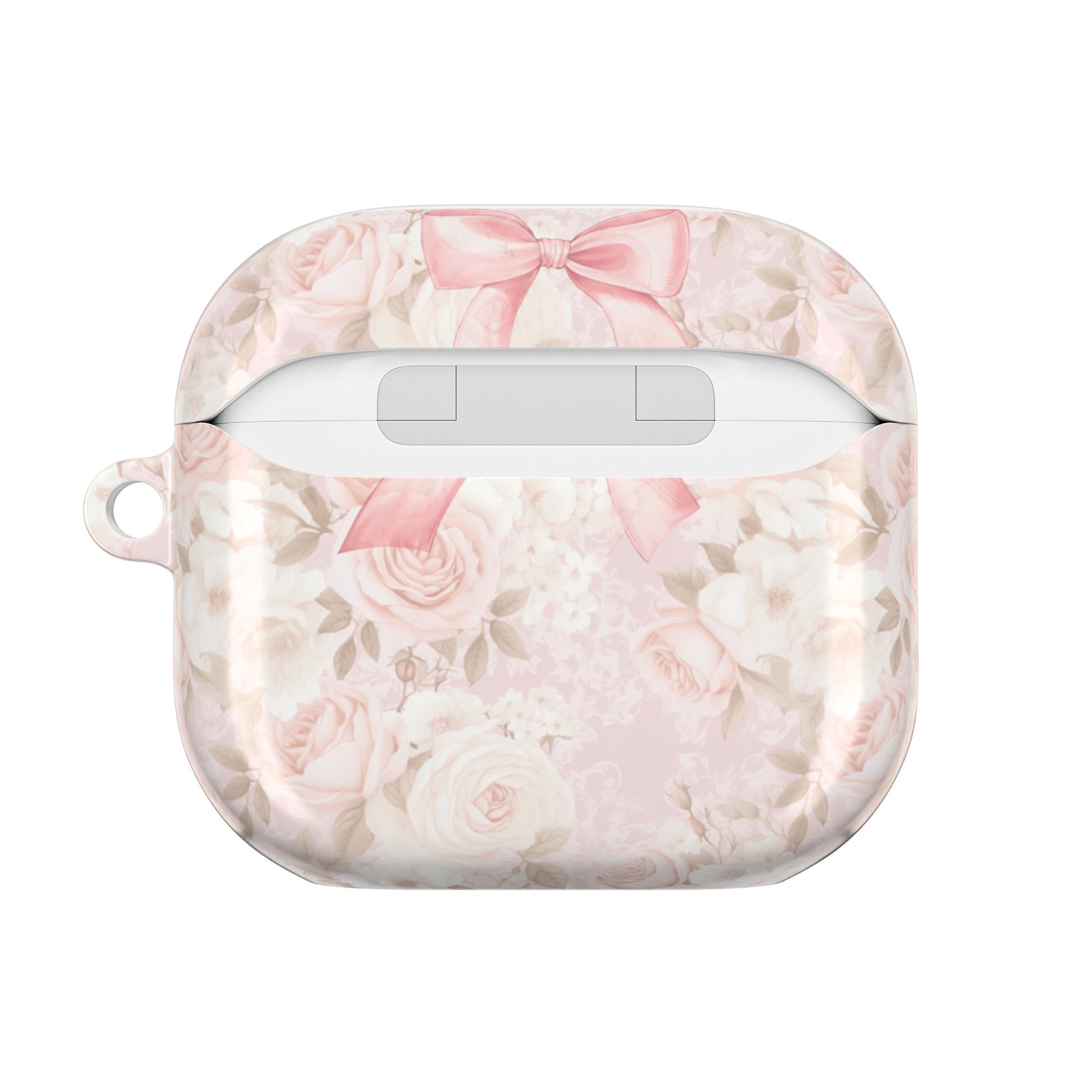 Chic and stylish AirPod case featuring a pink bow and floral design. Perfect as a gift or for personal use, this one-of-a-kind case is a great stocking stuffer. Ideal for adults who value both fashion and functionality, this case is qi compatible and made of durable, lightweight polycarbonate material. It exceeds BPA levels and complies with various safety standards, making it a safe choice for any buyer. Made in South Korea, this case comes with a glossy finish and includes a carabiner for convenience.