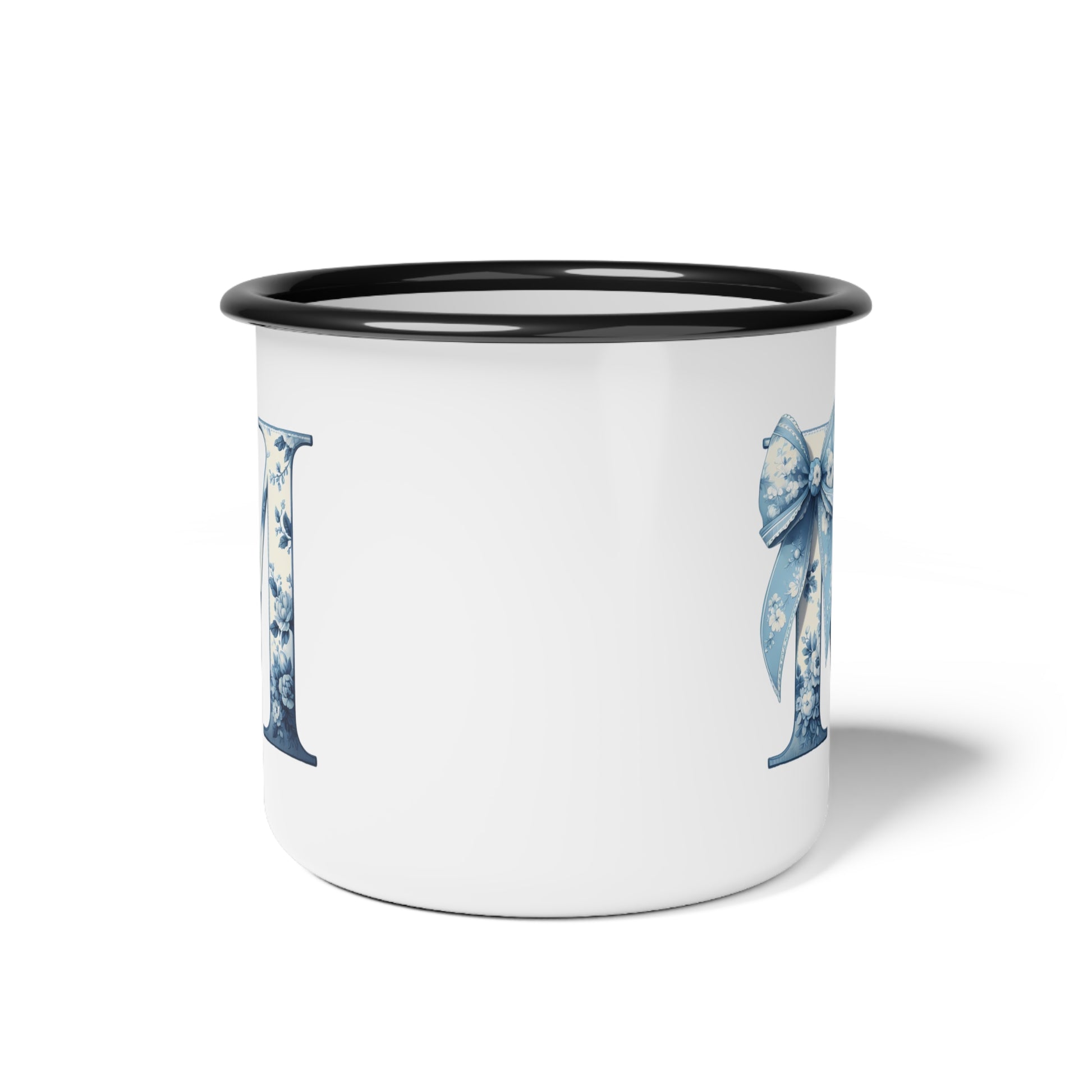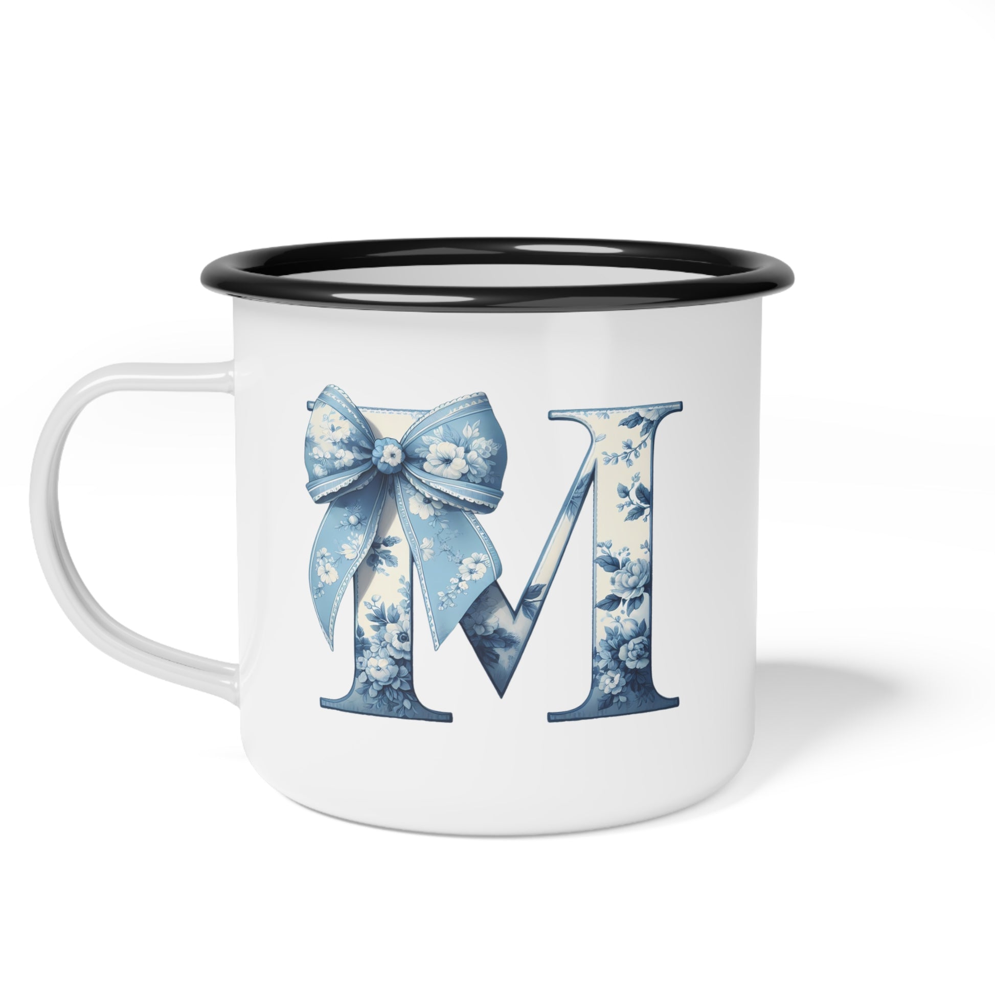 Customize your own Enamel Metal Mug with a Blue floral design. This mug is not only great for gifts but also perfect for kids since it's durable and won't break easily. The personalized mug is a keepsake that you'll treasure for years, making it a forever kind of mug with a blue bow accent. Built to be cherished, this mug is perfect for everyday use or special occasions.